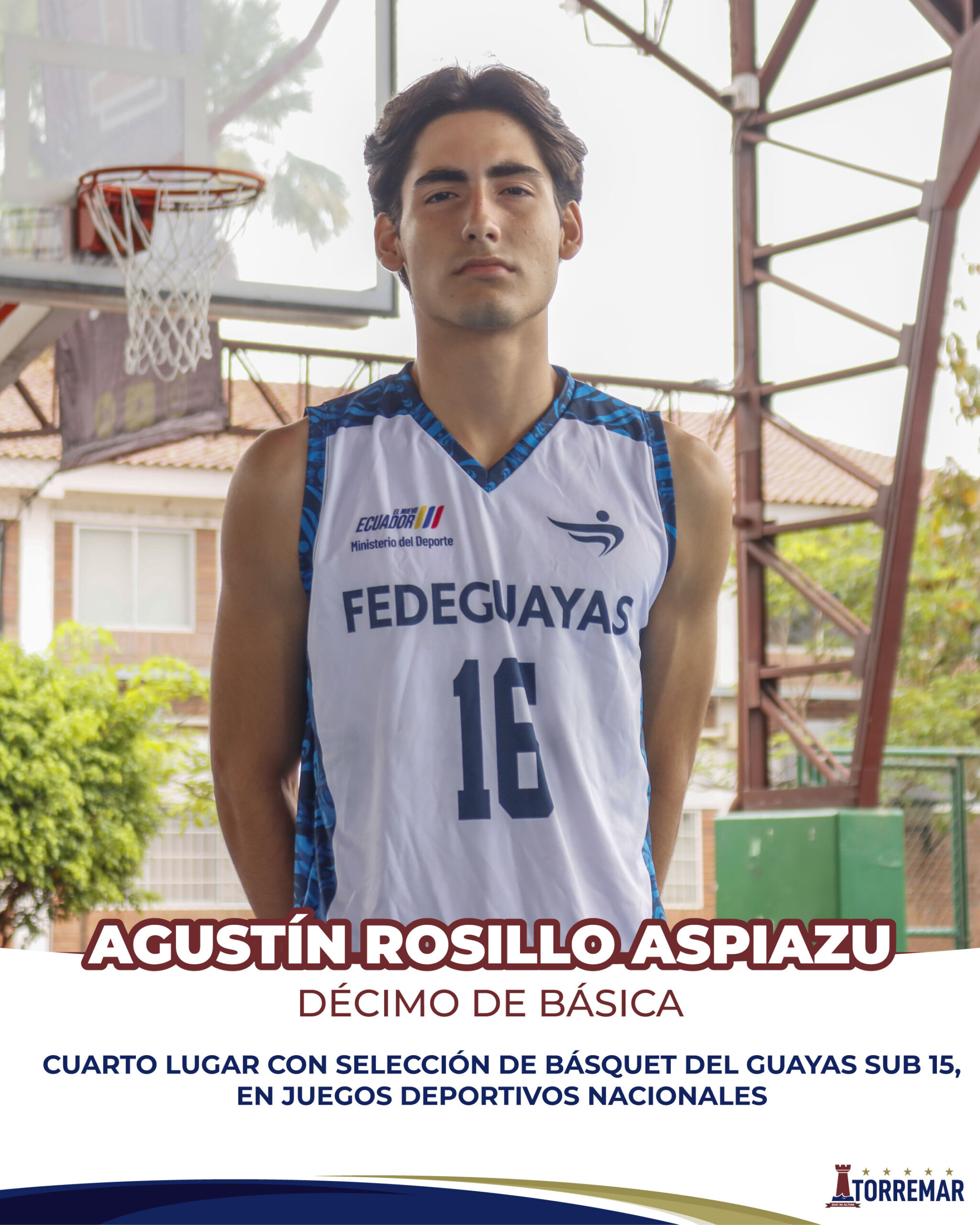 Por segundo año consecutivo, nuestro alumno Agustín Rosillo Aspiazu, de décimo de básica, integró la selección de básquet del Guayas, categoría sub 15, la cual ocupó el cuarto lugar en los Juegos Deportivos Nacionales.